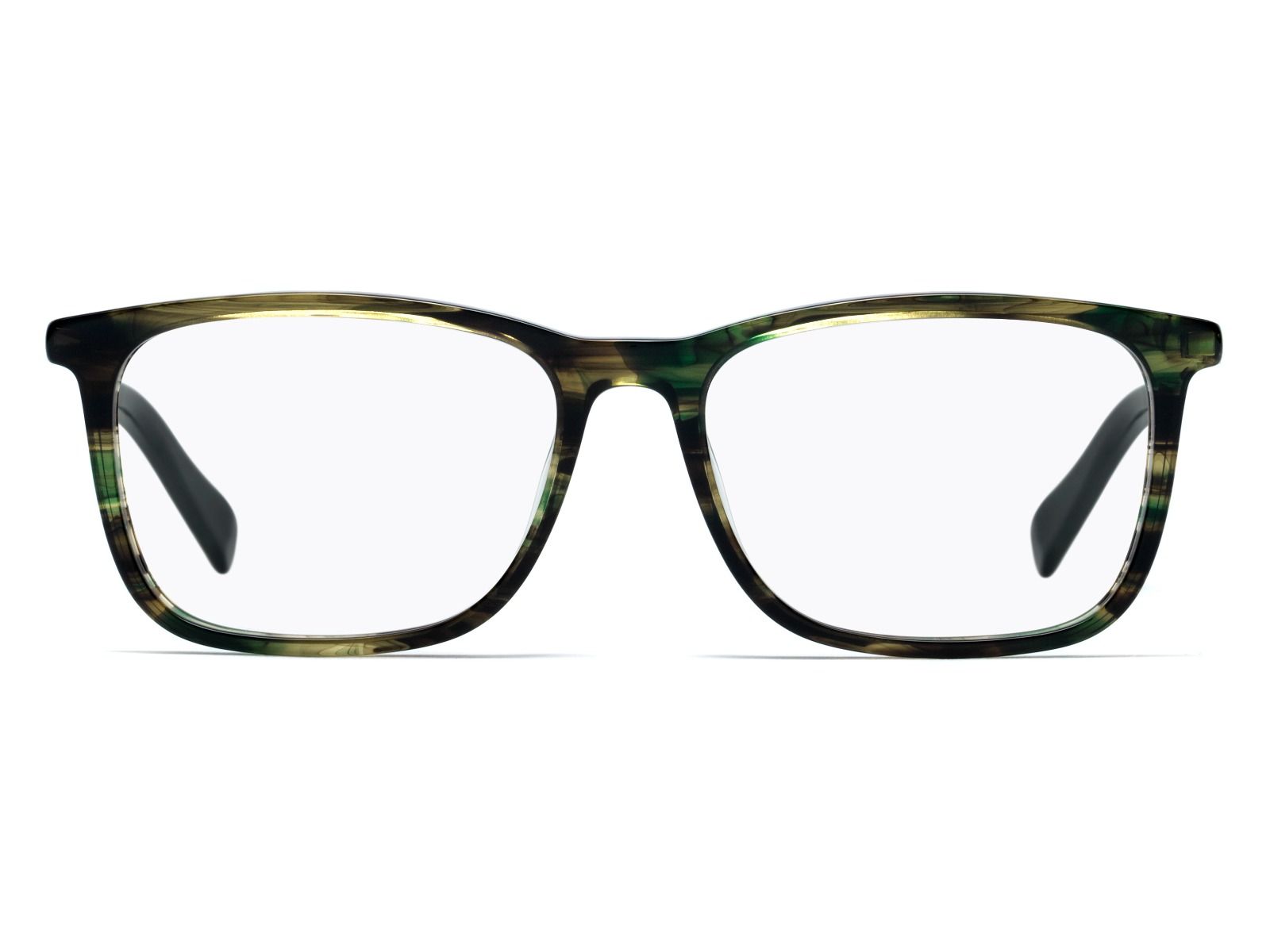 Wyraziste oprawki do okularów marki BOSS. Te oprawki do okularów wykonane są z acetatu co zapewnia odporność na uszkodzenia. Zauszniki mają nadruk laserowy z logo BOSS.
